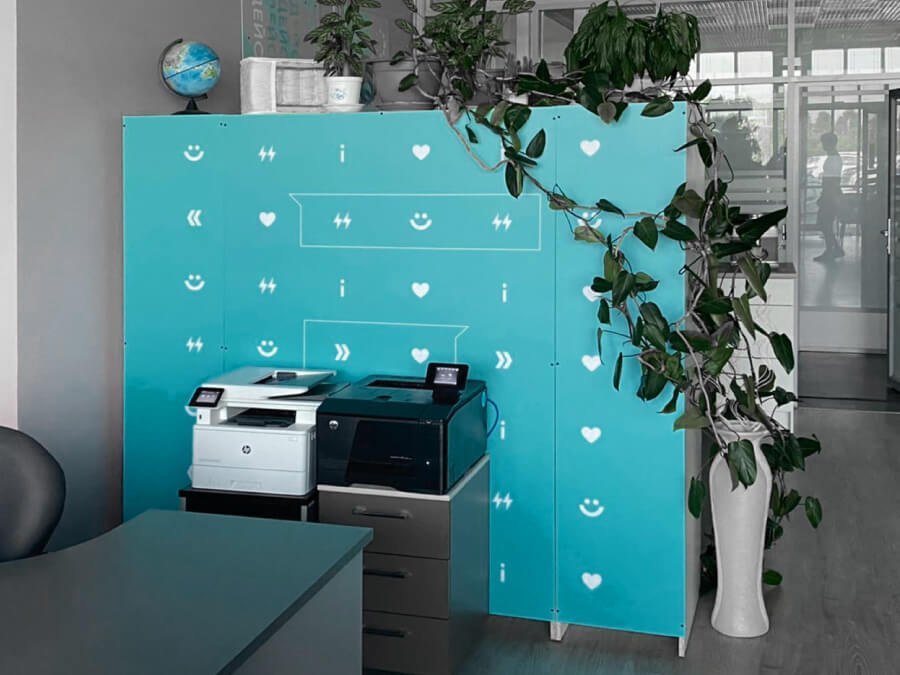 В каждом офисе рано или поздно возникает ситуация, когда информационные и интерьерные носители устаревают. Это связано с целым рядом причин: недавнее обновление фирменного стиля или разрыв во времени производства интерьерных элементов, которые изготавливали на разных этапах развития компании. Отсутствие стандартов оформления или недостаток пространства для размещения плакатов. Подобные факторы приводят к образованию в интерьере визуального шума, из-за которого падает эффективность каналов информирования сотрудников на местах.