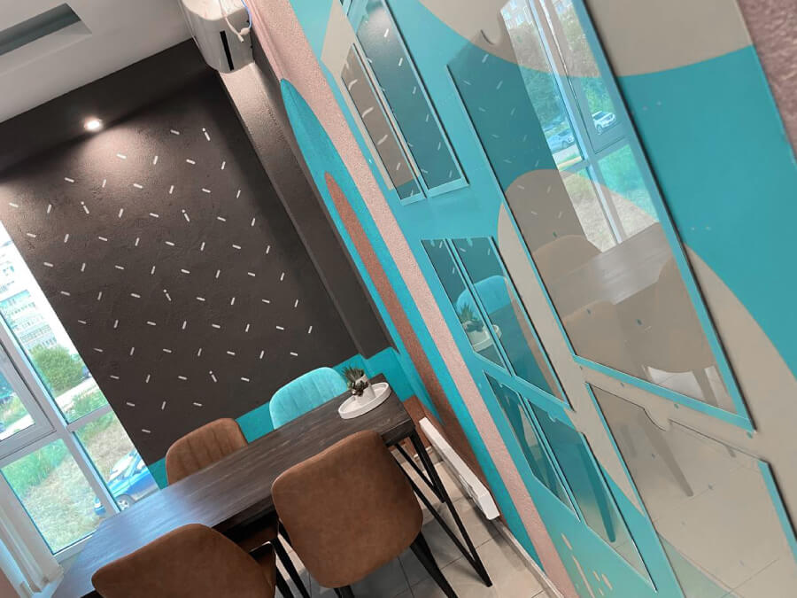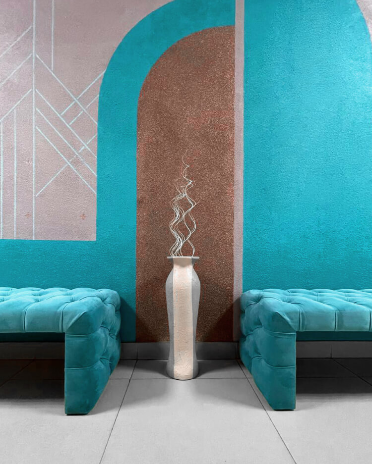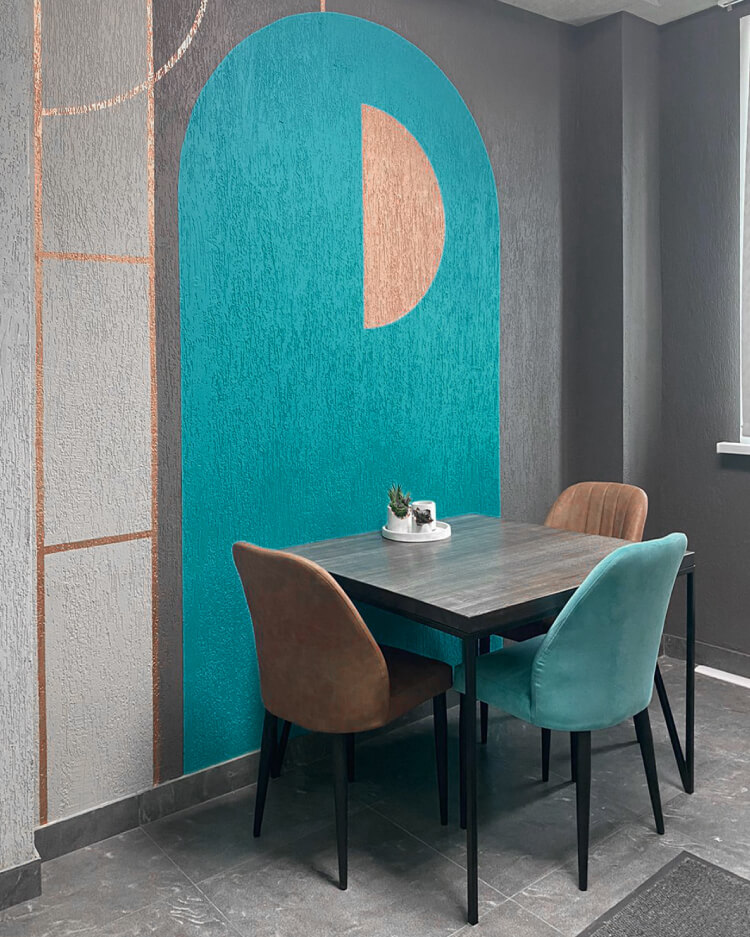 Арочные зеркала, совмещённые с геометрией росписи, стали функциональным акцентами в пространстве.