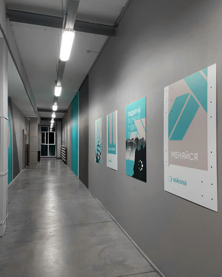 На постерах поменьше мы разместили ключевые даты в истории компании и связанные с ними события. Когда подобные композиции появляются в производственных интерьерах, возникает стойкое ощущение галерейной экспозиции, и пространство преображается.