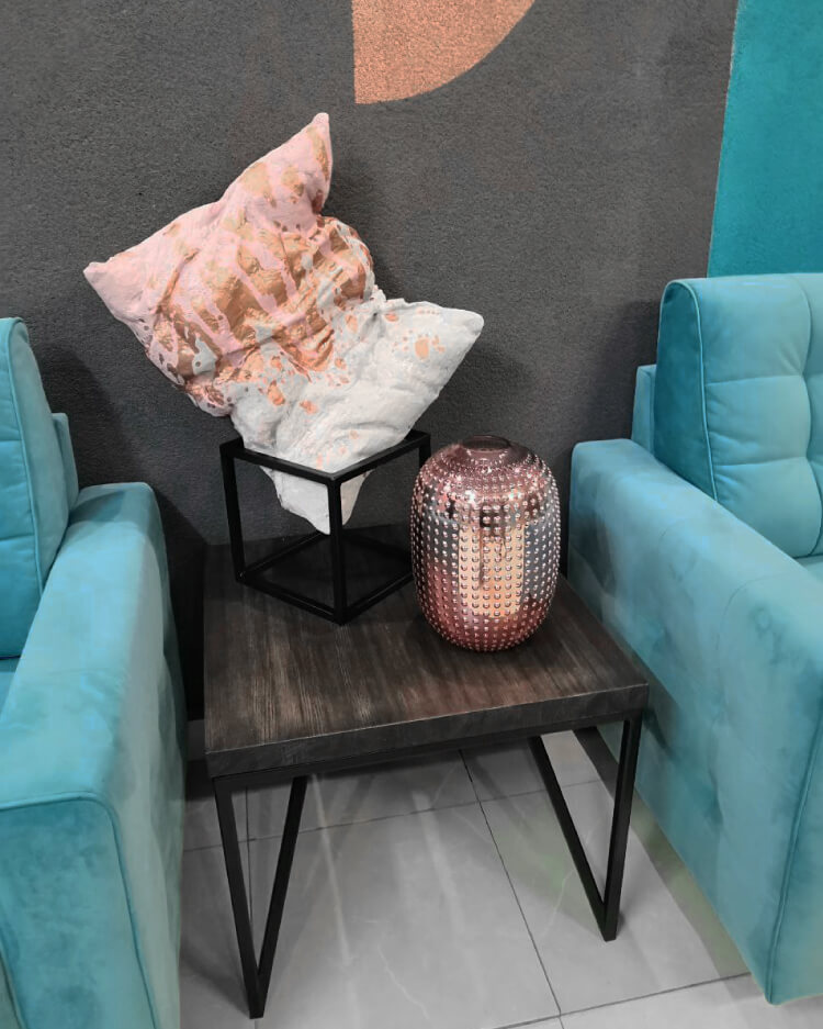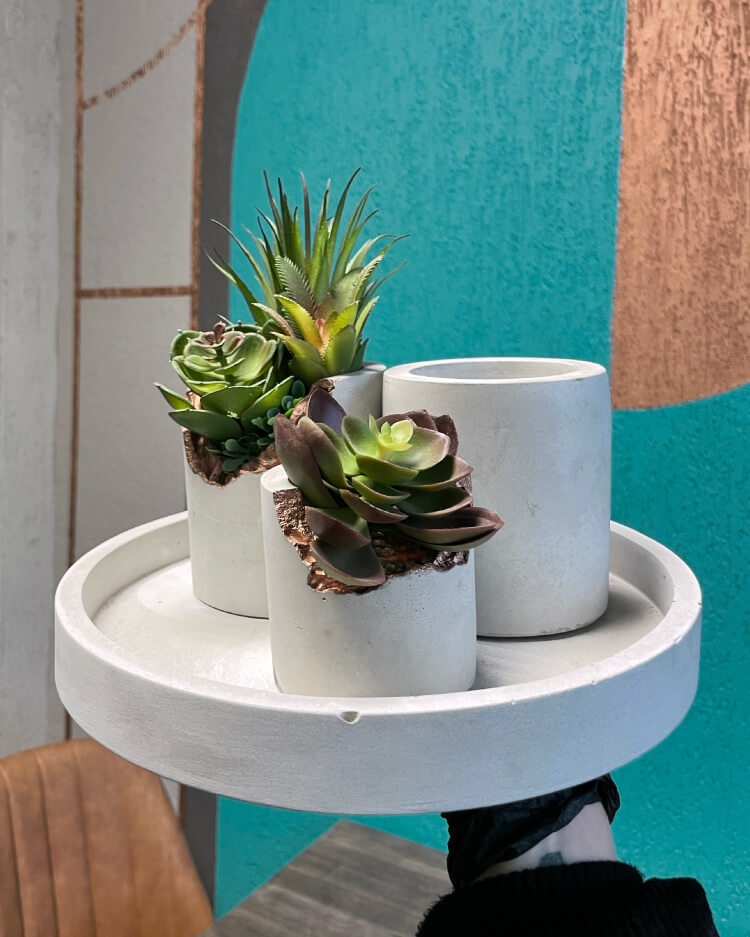 Мы никак не могли обойти заполнение пространства бутафорией и точечным декором. Яков, Офелия и Полина постарались на славу. Они собирали композиции из искусственных суккулентов и хлопковых коробочек, прототипировали и отливали вазы с подставками из бетона.