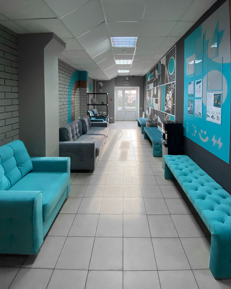 Внутри мы создали велкам-зону, где человек может с комфортом дождаться своей очереди и заполнить заявление, а попутно ознакомиться с жизнью команды и историей компании через фотографии на стендах и постерах.
