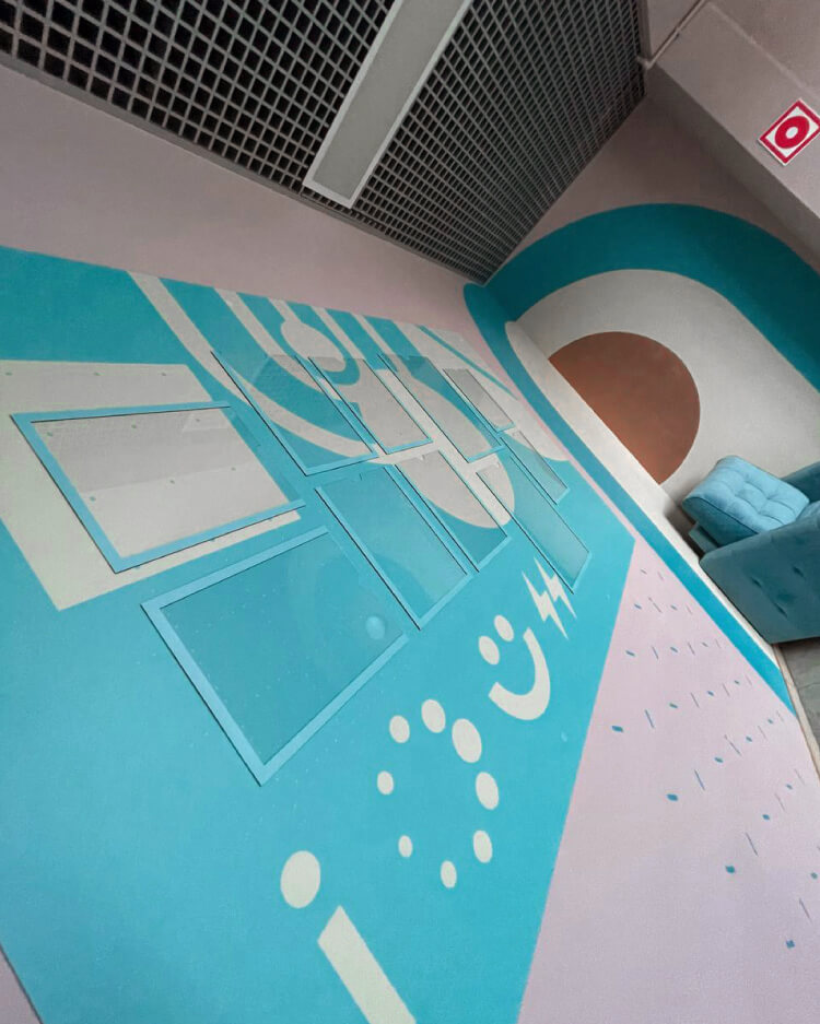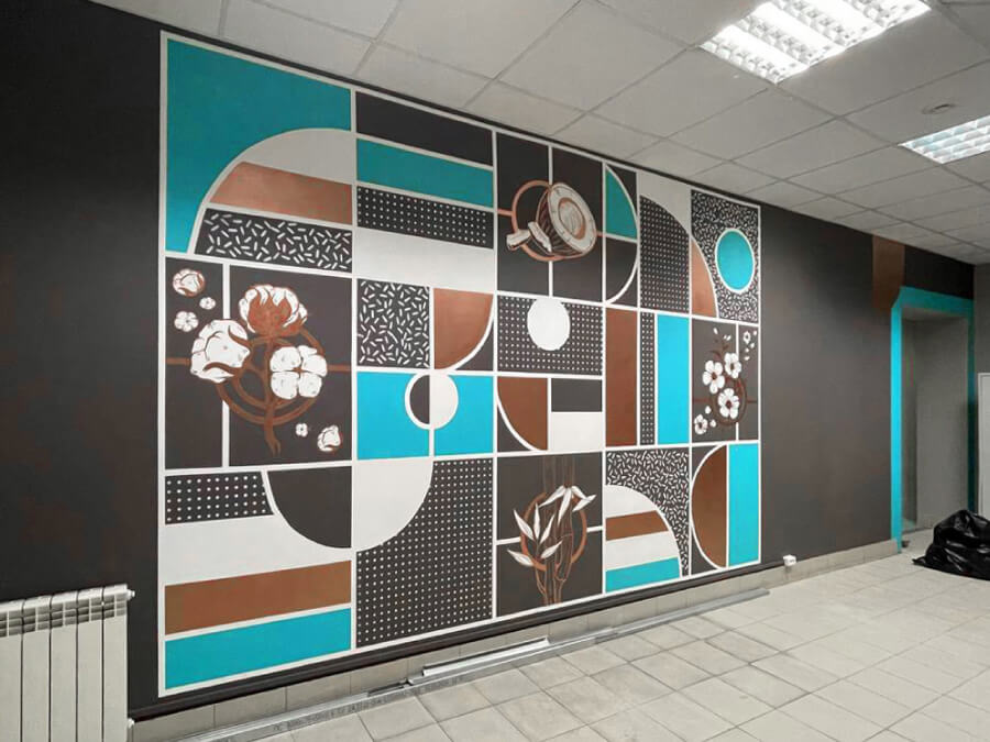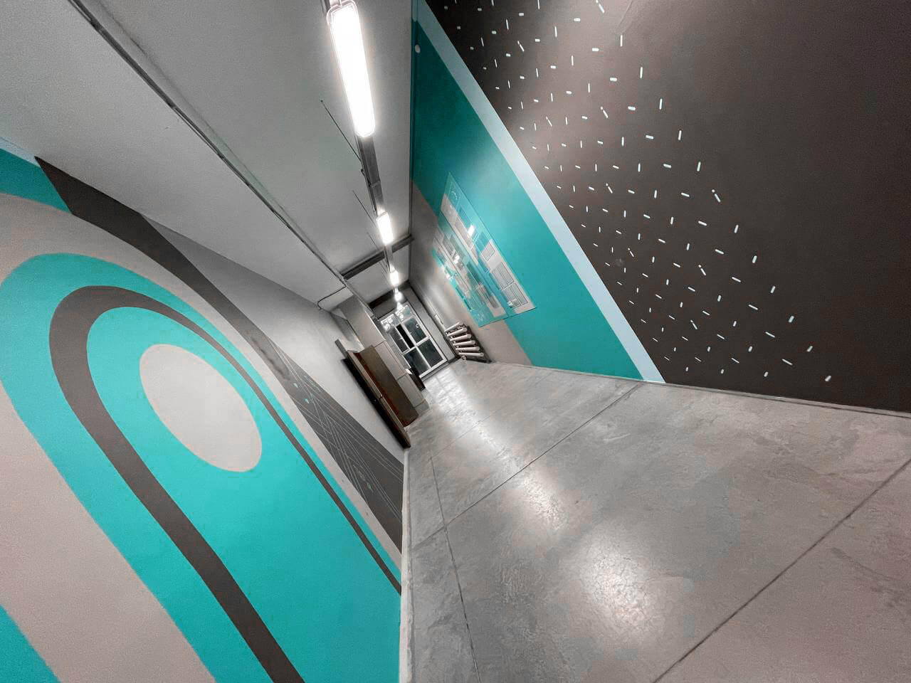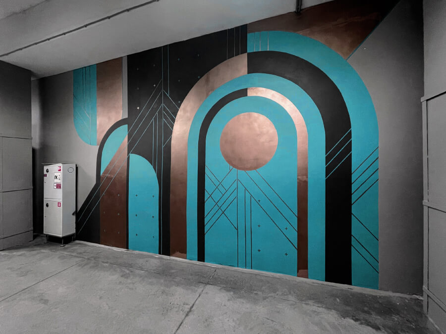 Функциональная роль росписи — заполнение огромного пространства и расстановка акцентов. Стены мы замостили геометрическими переходящими формами. Часть из них мы сгенерировали произвольно на месте, исходя из особенностей конкретной площадки.