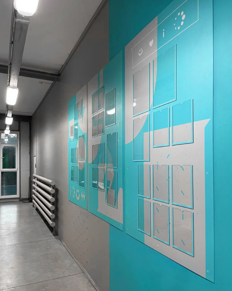 Магнитные карманы разных форматов и сменные новостные рубрики позволили варьировать размещение и ориентацию плакатов, расставлять акценты на важном. Мы не подстраиваем контент под стенды, а размещаем плакаты, исходя из задач и потребностей. Зоны для стендов мы выделяли с помощью отдельного паттерна.