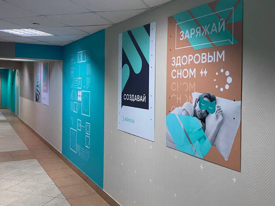 Мы разработали дизайн, правила оформления и сценарии использования информационных стендов с рубриками. Применили печатные технологии в оформлении, добавив макеты оклейки стеклянных перегородок, постеры с ценностями и историей. Показали роспись на примере пилотных зон.