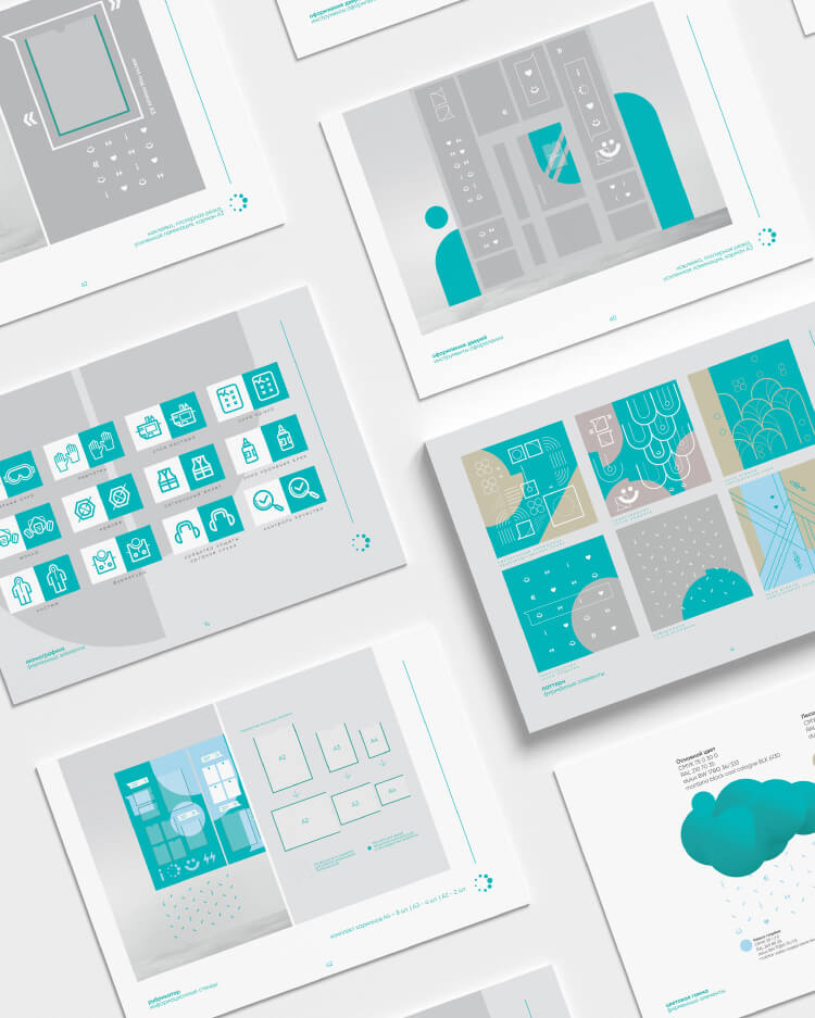 Марина разработала айдентику проекта: орнаменты, иконографику и цветовые схемы. В основе паттернов были абстрактные геометрические формы, поддерживающие атмосферу и отсылающие в деталях к производственным линиям и бренду работодателя. Орнаменты использовали в дизайне всех носителей на этом проекте.