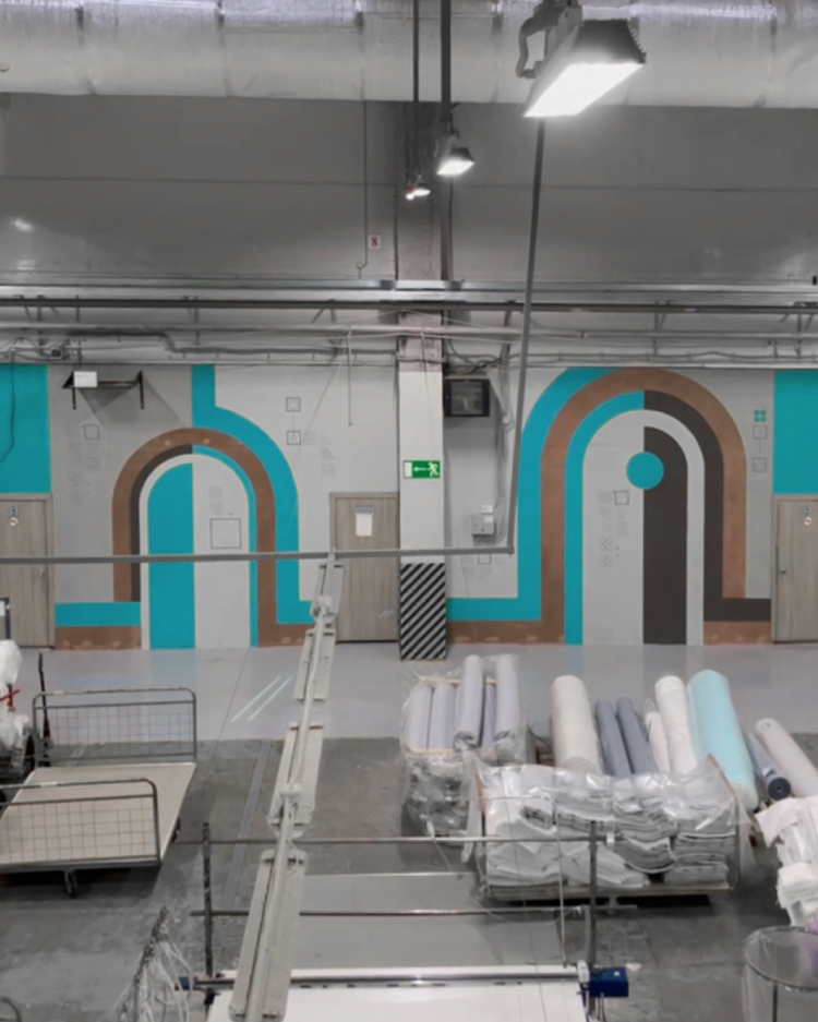В зависимости от принадлежности зоны к производственной или административной части мы использовали различные орнаменты. В основе одних были коммуникативные облачка, «лица» и арочные фонтаны. В основе вторых — абстрактные образы производственных линий и элементов фурнитуры. Часть росписи выполнили бронзовой краской для придания эффекта переливающейся фактуры.