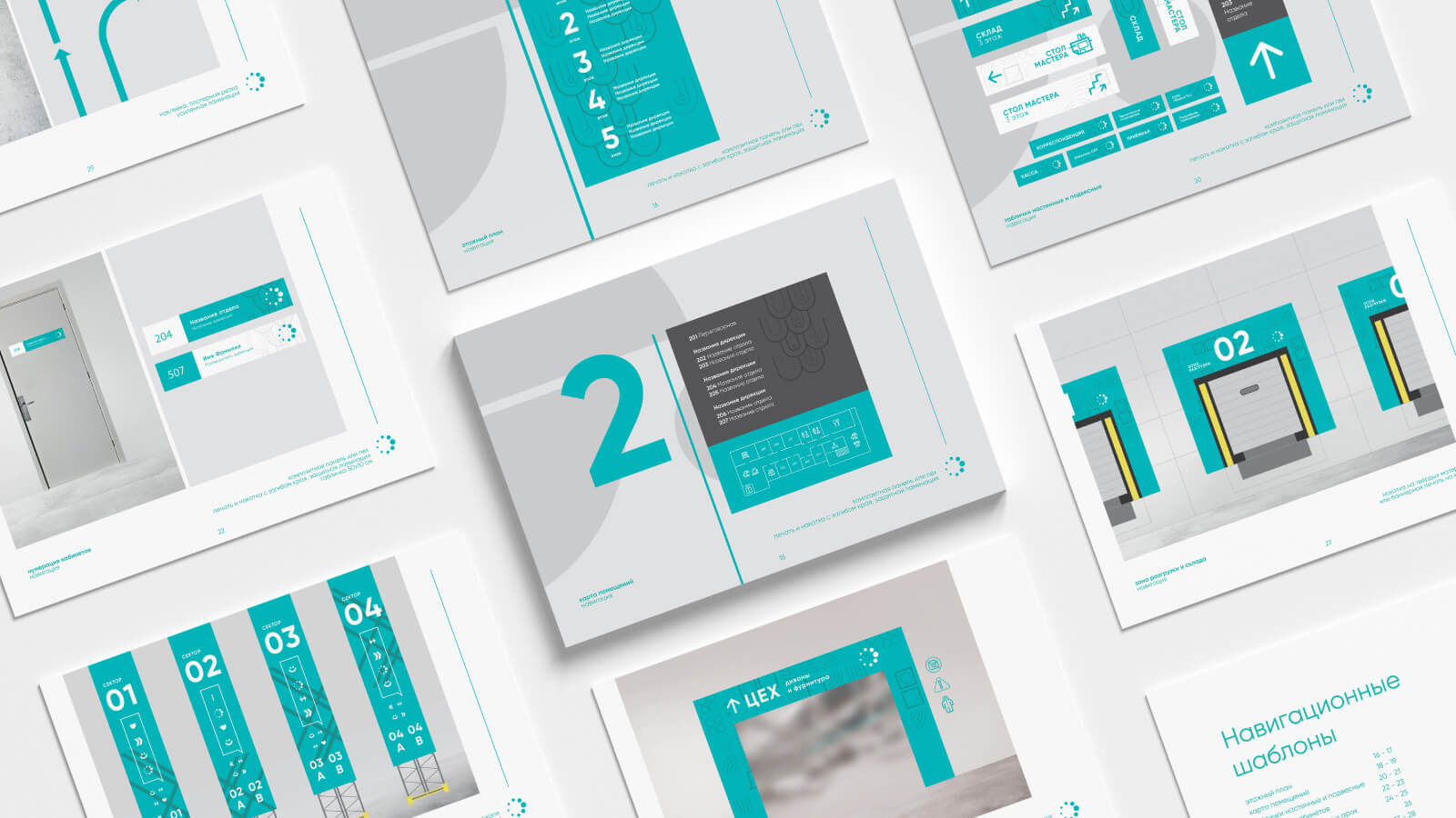 Были созданы навигационные шаблоны для использования внутри помещений и на уличной территории: таблички, указатели, поэтажные планы, примеры оформления столбов и дверных проёмов.