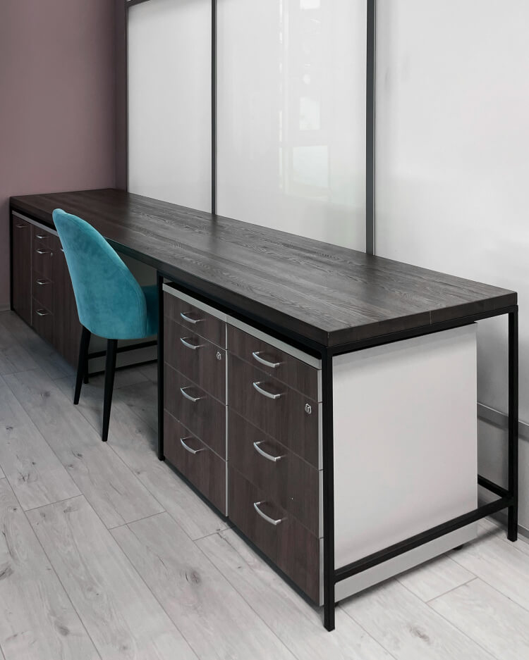 Каркасы были изготовлены из металла с покрытием порошковой краской в чёрный цвет. Стеллажи мы использовали в качестве разделяющих перегородок для зонирования. Многие элементы мебели изготавливались под геометрию конкретных площадок и проёмов с точностью вставки до 3 мм.