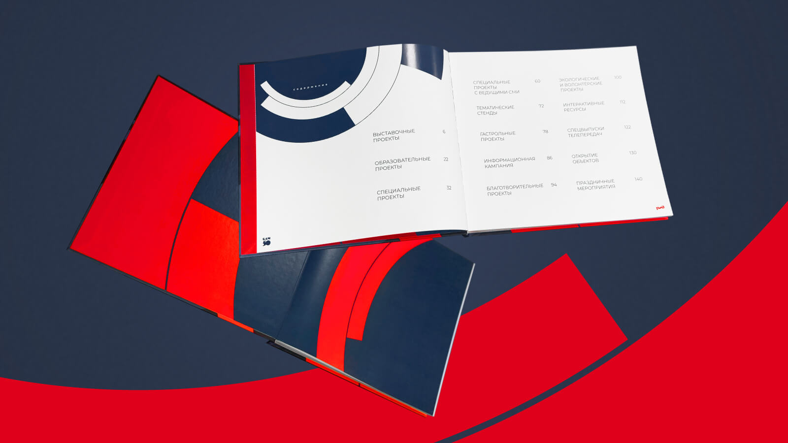 Мы использовали лаконичные шрифты, контрастные цвета и геометрические плашки, переходящие с разворота на разворот. Марина разработала тематические разделители, ёмкую иконографику для фактов и базу мокапов для представления цифровых проектов. Все эти инструменты очень помогли нам на этапе вёрстки книги.