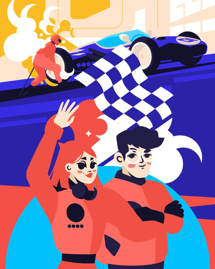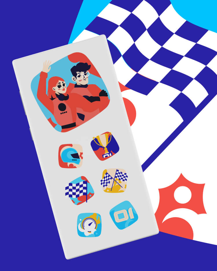 Динамика пропущена через весь визуал и поддерживается в логотипе и деталях: дыме от жжёных шин, ревущем двигателе, развевающемся флаге. В начертании и фоновых цифрах Марина отразила образы трассы, символизирующие направление движения компании. Изображение сочетается с брендом за счёт использования яркой цветовой гаммы и плавных форм. Мы адаптировали концепцию под разные форматы и создали дизайн иконографики и макетов для использования в дни проведения. Дополняли коммуникации, выводили на экраны в зале и в фотозоне, отразили в формате бейджей и информационных материалов.