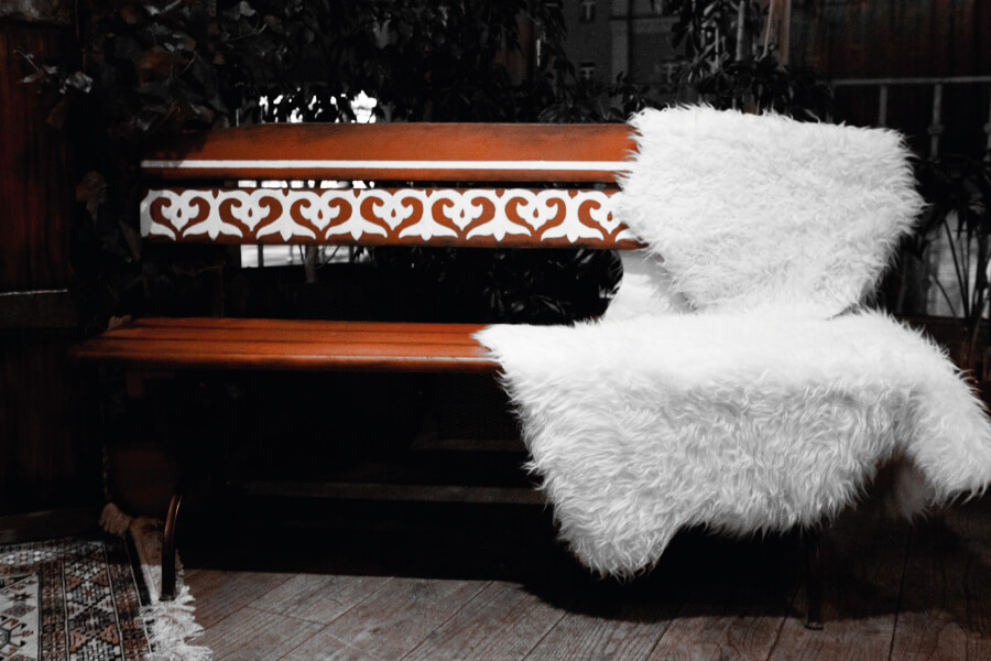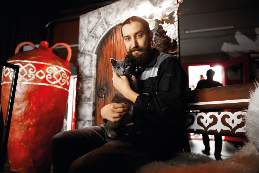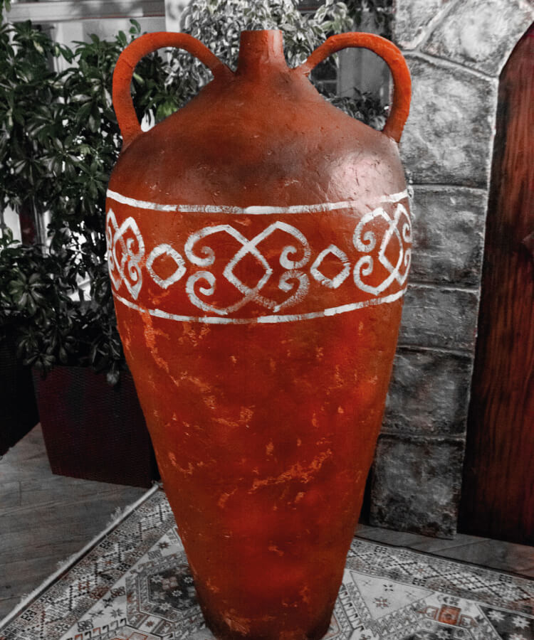 Магия этого проекта в том, что ключевые объекты фотозоны были изготовлены из подручных материалов. Дверь выпилили из куска фанеры, стилизовали и состарили под стать остальному интерьеру, ручки вытачивали из цельного металла. Центральный объект композиции — амфору — сделали из пеноплекса и пены, искусственно присыпав пылью прошлых эпох. Подходящий ковер с традиционным орнаментом и стилизованная скамейка из дерева завершили композицию.
