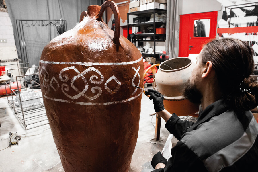 В основе фотозоны образ традиционного погреба для вина — с амфорой, виноградной лозой над дверью, старинным светильником. Грузия не только производит прекрасное вино, это одна из немногих стран, где некоторые виноделы все еще используют амфоры (они называются квеври).