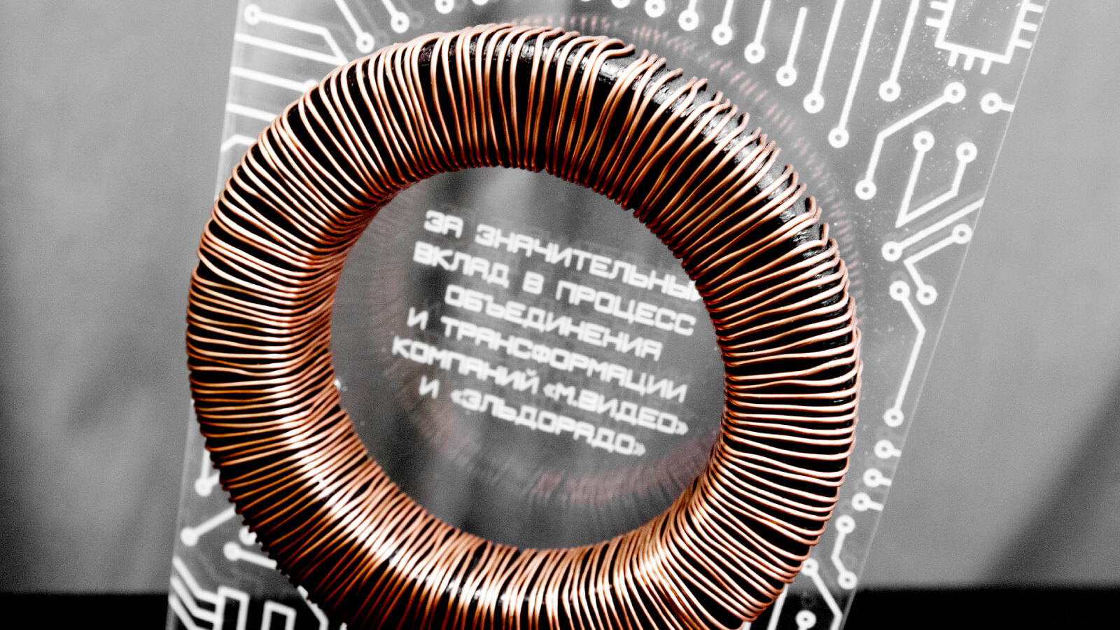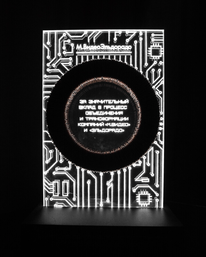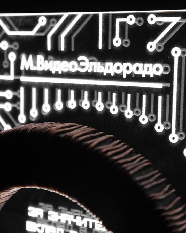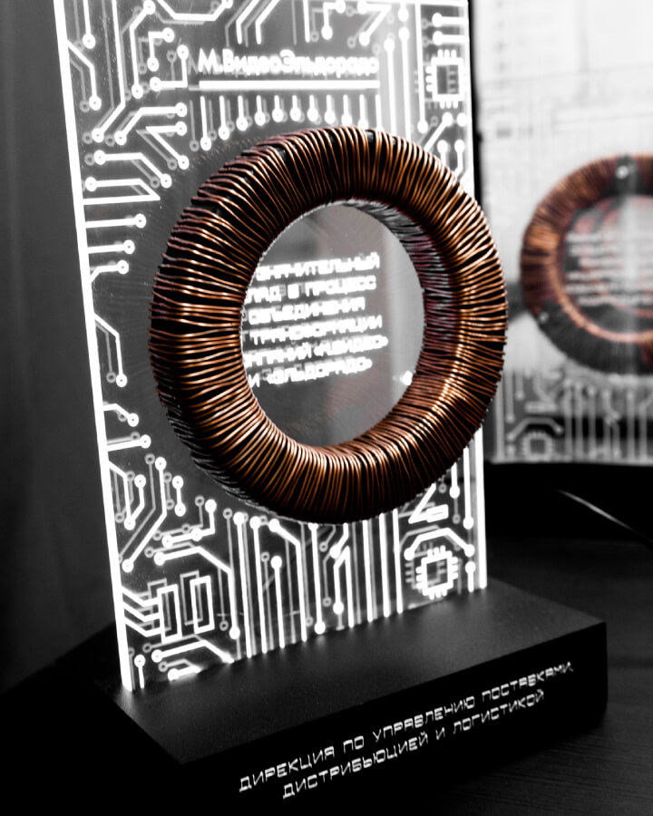 В апреле произошло окончательное слияние двух крупнейших игроков на рынке электронных товаров: брендов компаний «М.Видео» и «Эльдорадо». Наши коллеги из агентства «Арт Премьер» организовали серию корпоративных мероприятий, посвящённых этому историческому событию. Нам доверили задачу разработать и произвести серию наград за вклад в процесс объединения для финальной церемонии. Так как тема электричества была основополагающей в оформлении мероприятия (прим.: символизм — ток, пробегающий между людьми), было высказано пожелание — интегрировать в награду трансформаторную катушку.