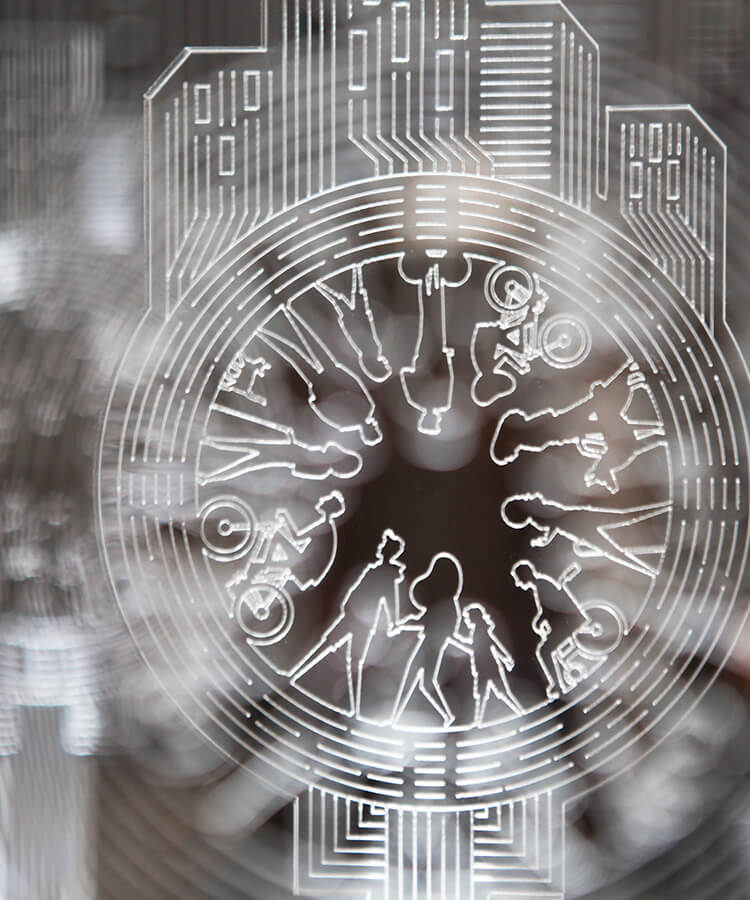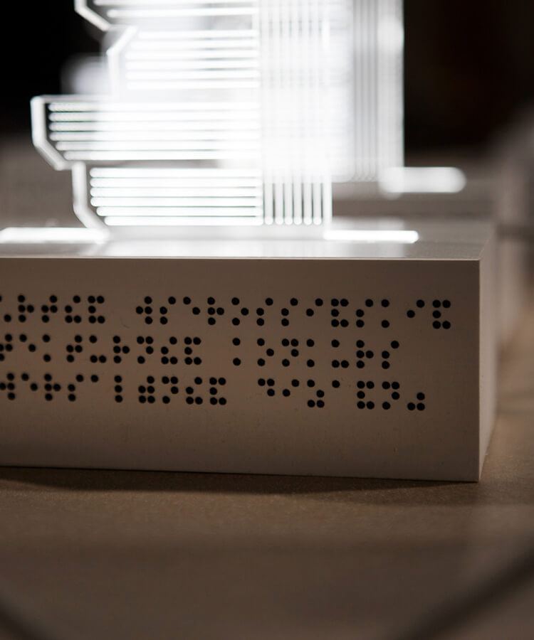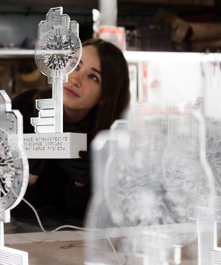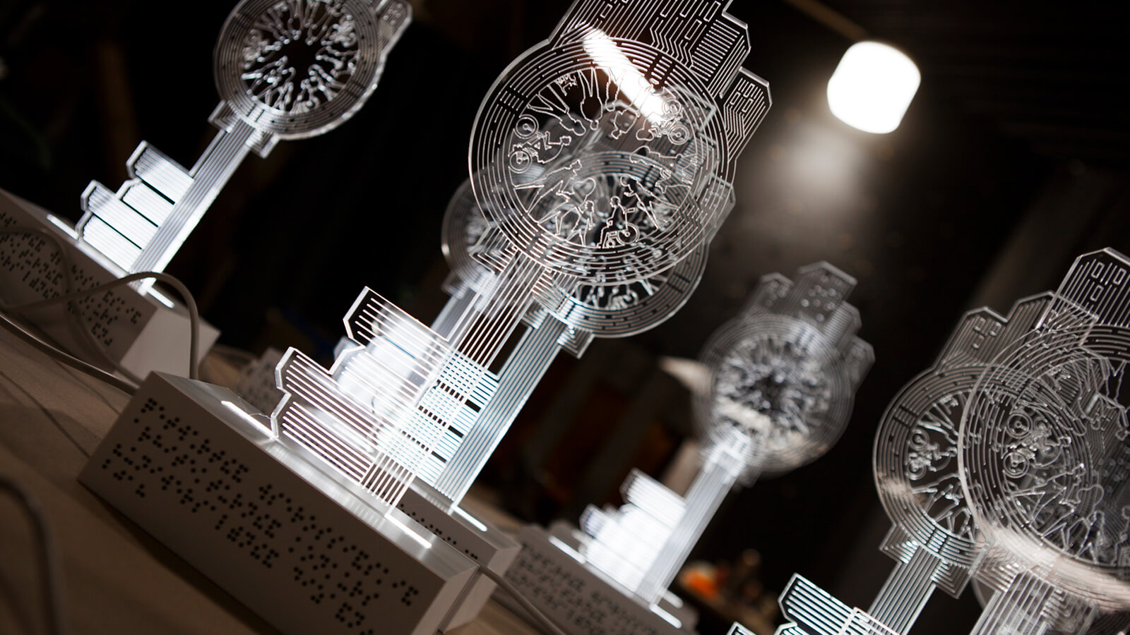 В форму ключа интегрировали композицию из архитектурных форм (прим. здания) и линейных элементов, которые отсылают нас к дорожной разметке. В центре — главные действующие лица этой истории: городские жители, активные участники городского движения. Мы перенесли иллюстрацию при помощи гравировки на светорассеивающие панели, изготовили постаменты со встроенной подсветкой и установили тактильные таблички с названием конкурса в основании.
