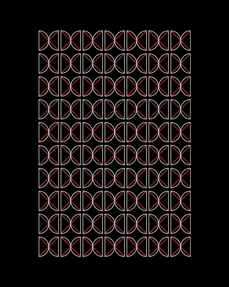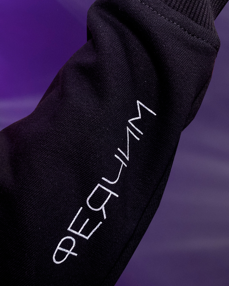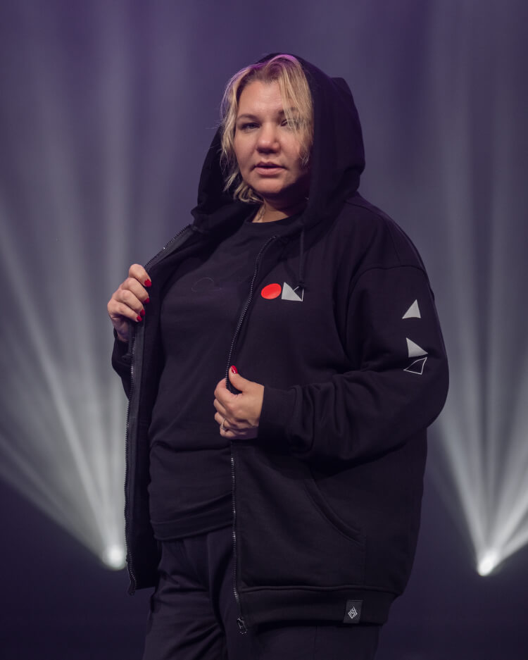 Марина создала пять паттернов, образованных из логотипа: многоуровневые, линейные, полноцветные, монохромные. Выбранный по итогу вариант в красно-белом цвете напечатали пластизолем на зипперах и студийных футболках. Чёрный логотип с небольшим подъёмом расположили на груди футболки, паттерн же ушёл на спинку.