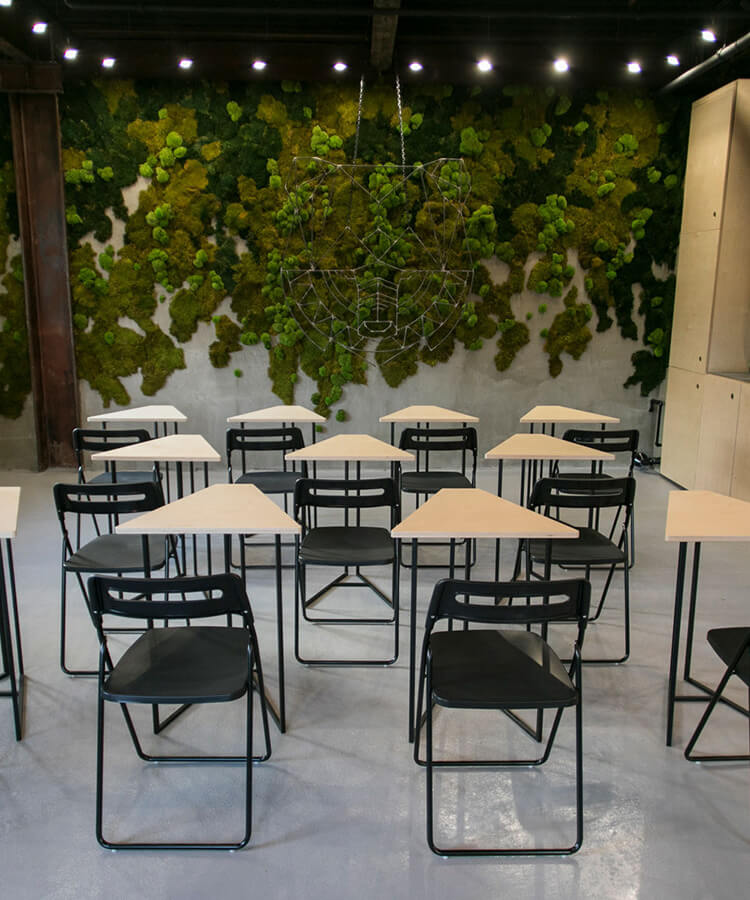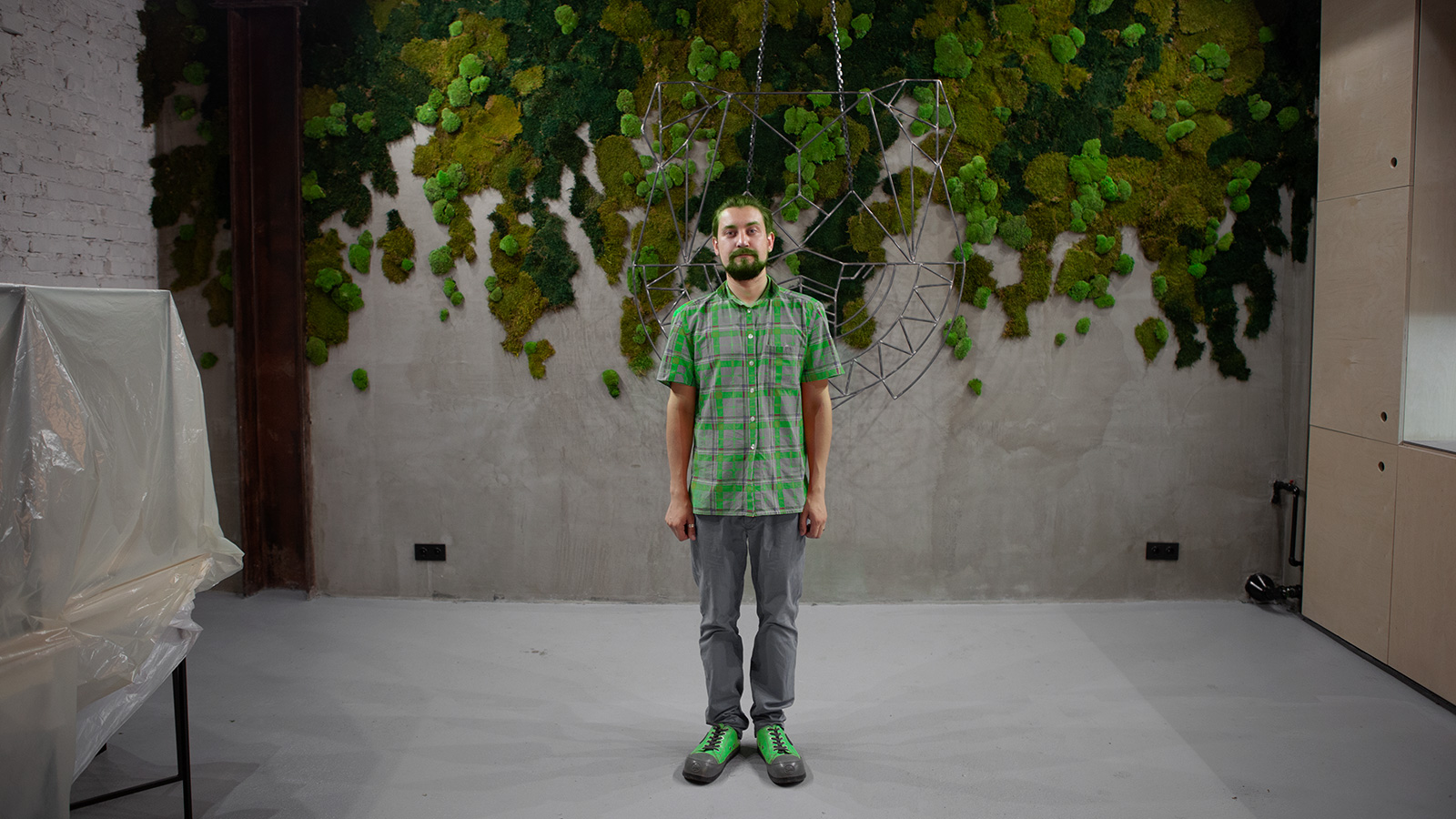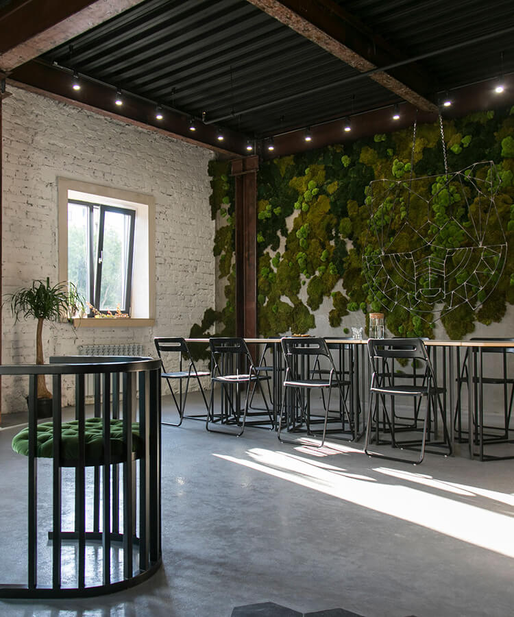 Яков и Саша декорировали стену в течение нескольких дней, используя разные типы стабилизированного мха и чередуя его с кочками.