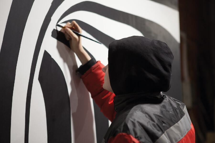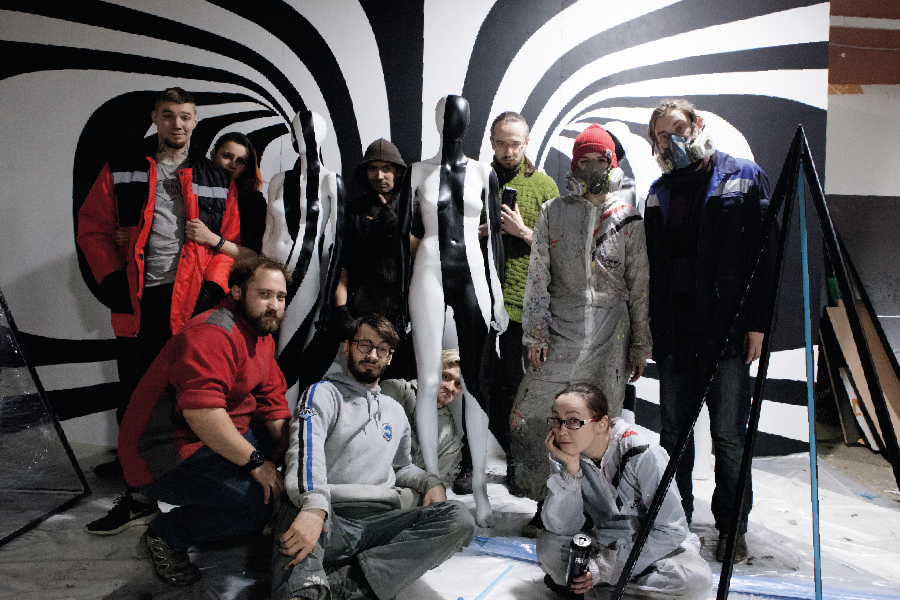 Промотаем время на неделю назад и заглянем в мастерскую студии. Вечер. Пространство разбито на три зоны. Вдоль стены расположилась массивная конструкция, исписанная карандашными пометками и цветовыми пятнами. Вдоль неё двигаются художники, постепенно заполняя холст. Рядом стоят и подсыхают залитые в белый манекены.