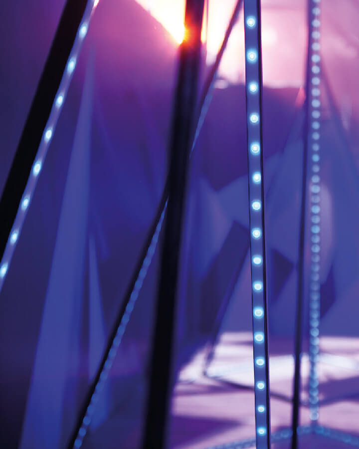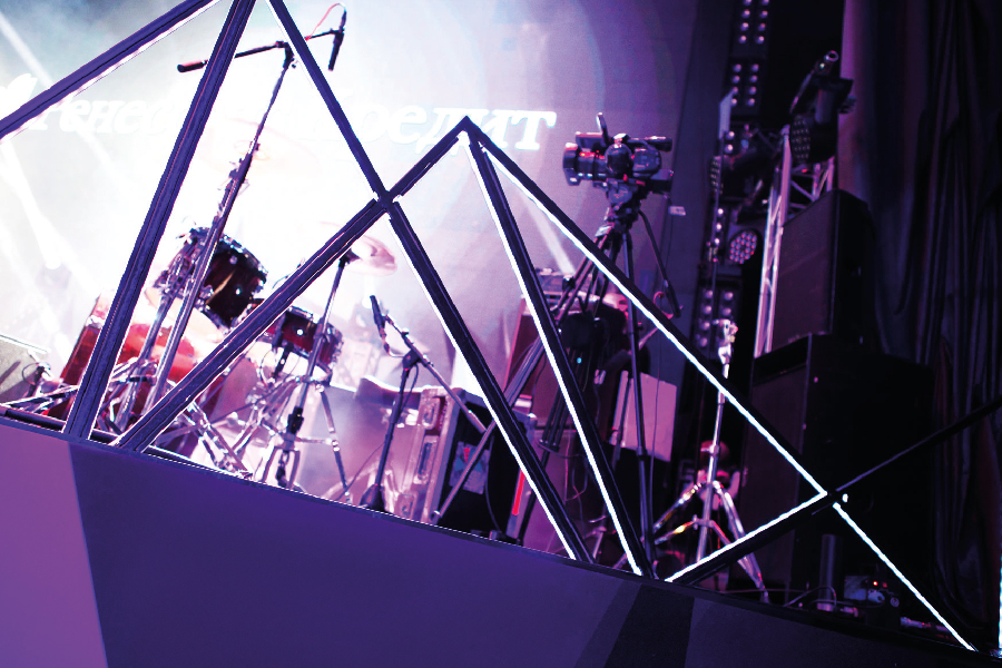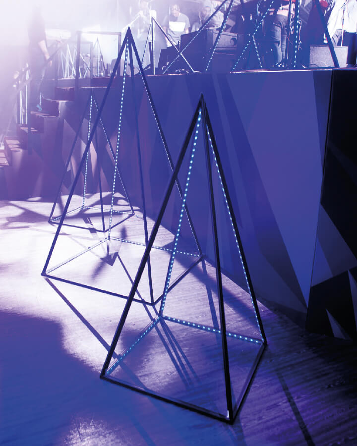 Ты в зале. Направляешься к сцене и поднимаешь взгляд. Перед тобой возникает гипнотизирующая картина. Глубоко-ядовитый фиолетовый цвет графики, нанесённой на натянутое вдоль сцены полотно, завораживает. Невесомые гранёные конструкции и пульсирующие пирамиды отбрасывают рассеянный свет в зал, погруженный в темноту.
