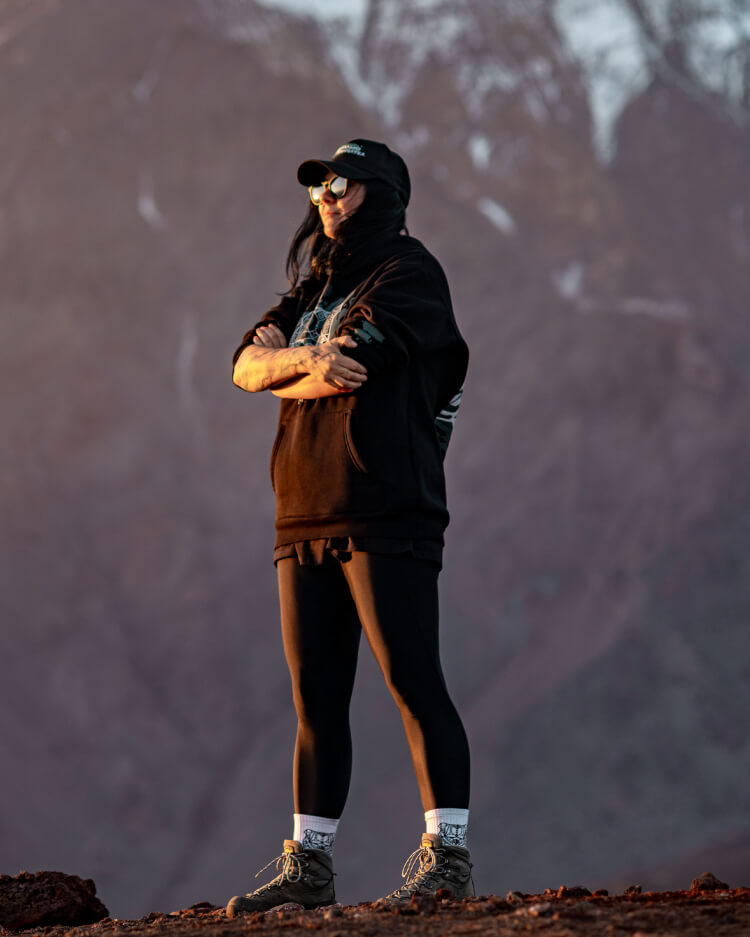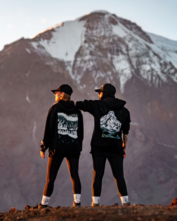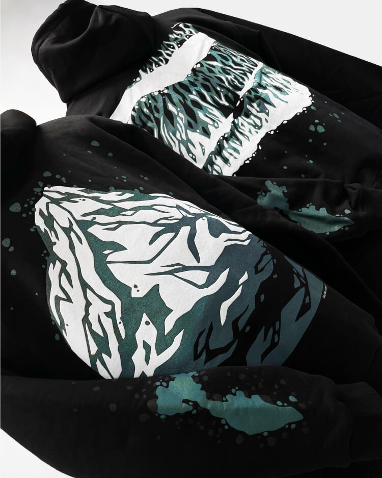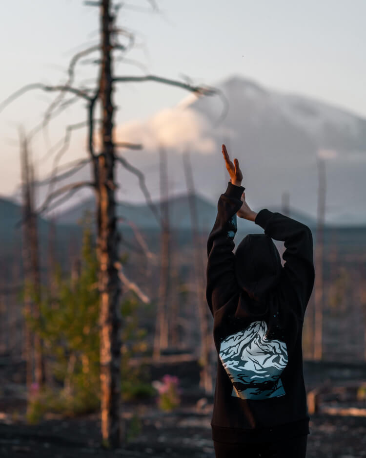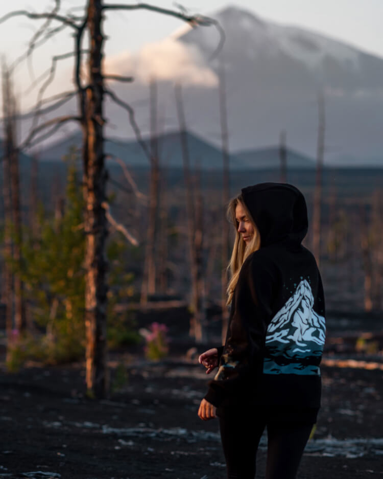 Силуэт гряды и фактура лавовых полей Толбачика легли в основу изображения, которое разработала Марина. С последнего извержения прошло уже много лет, и жизнь постепенно возвращается в долину: у подножия вулкан зарастает зелёным мхом. Иллюстрация на спинке стала центральным объектом в дизайне худи. Характерный для «Только Людей» зелёный цвет и фирменное сердечко, которое скромно прячется за мордой медведицы, стали связующими символами двух брендов.