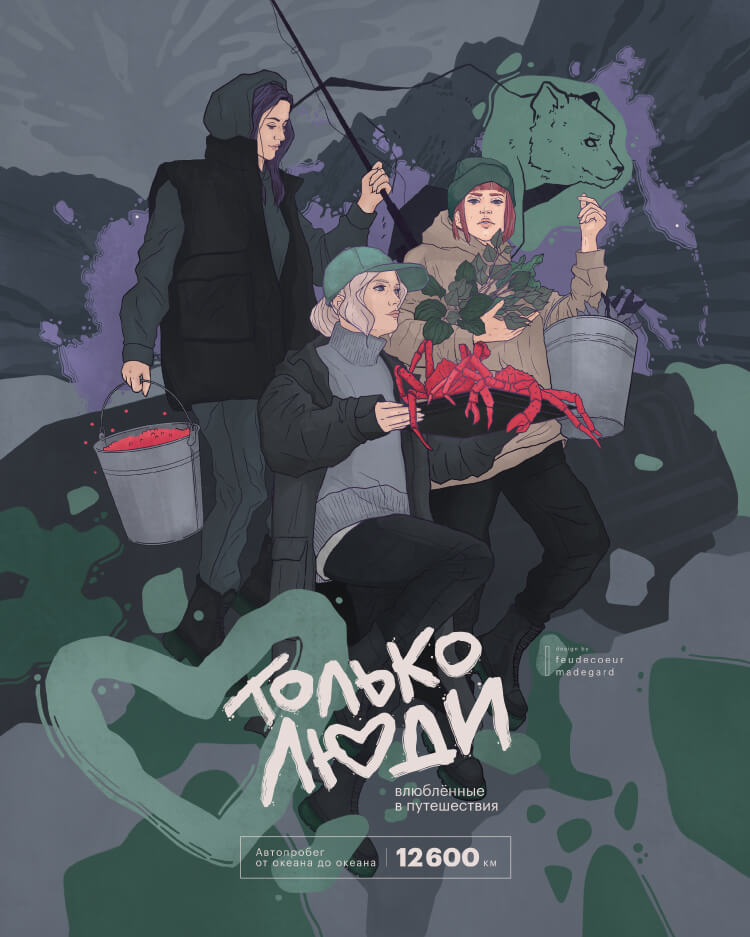 Марина создала ключевую иллюстрацию с изображением авторов пробега в окружении даров природы. Весь проект занял около трёх недель, одну из которых мы отвели под производство.