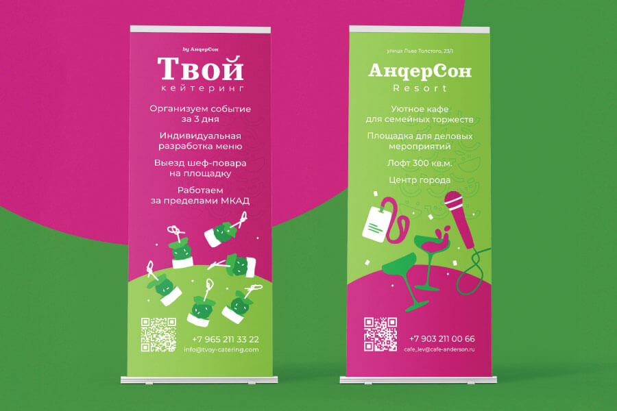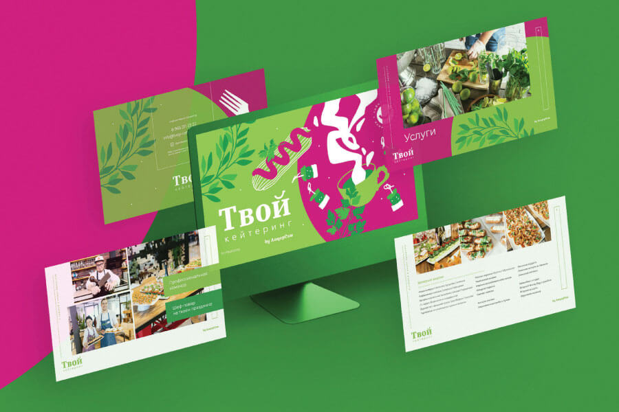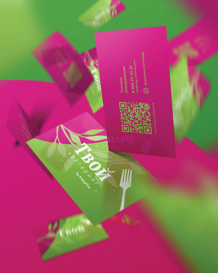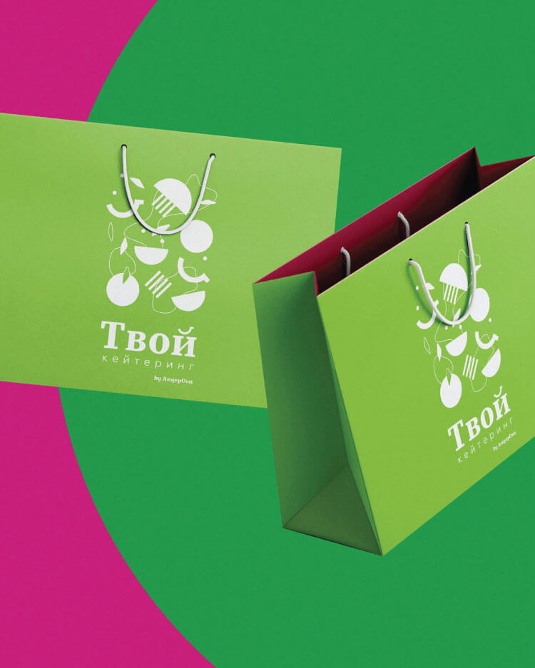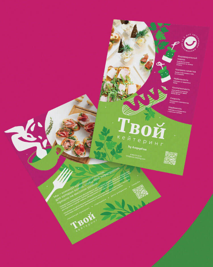 В какой-то момент доставка блюд на дом волшебным образом превратилась в выездное обслуживание с декорациями, шеф-поваром и превосходным уровнем сервиса. Так родился личный суббренд Алёны «Твой Кейтеринг», для которого мы разработали фирменный стиль.