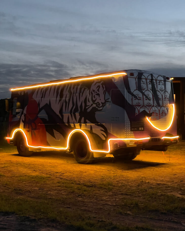 По низу автобуса и вдоль крыши мы разместили полосы из гибкого неона — в тёмное время суток его свет придаёт росписи и окружающему пространству особенное тепло и уют.