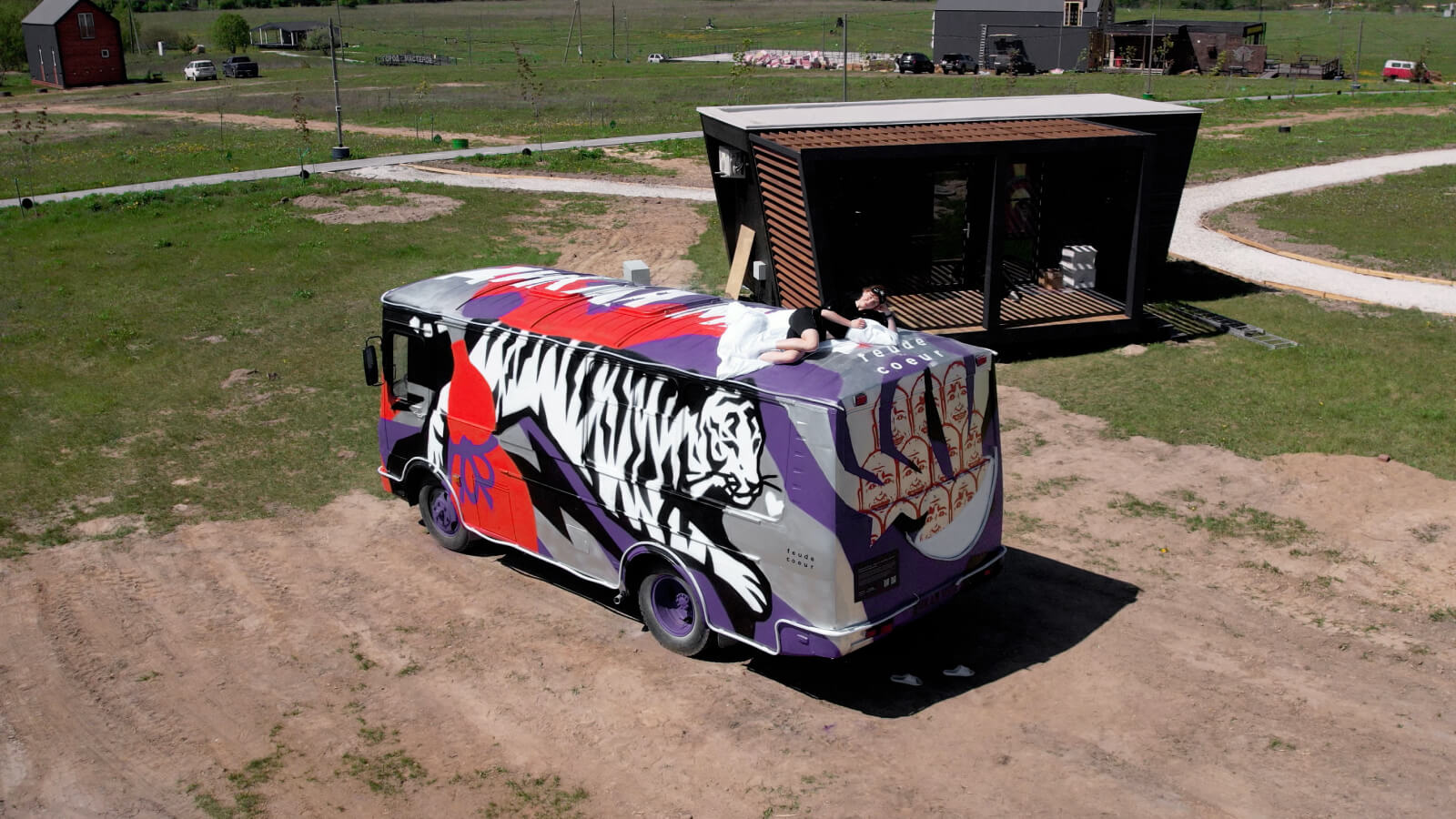 От нанесения первой разметки до финальных штрихов прошла неделя, за которую команда студии закончила две росписи и преобразила автобус. Роспись на домах мы дополнительно покрыли лаком для большей износостойкости.