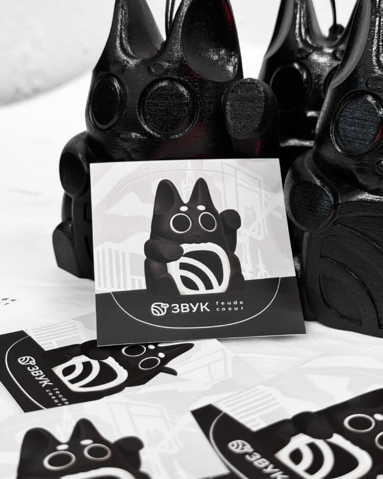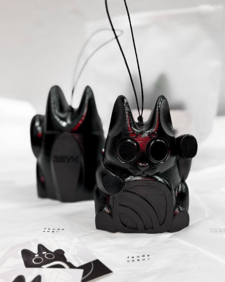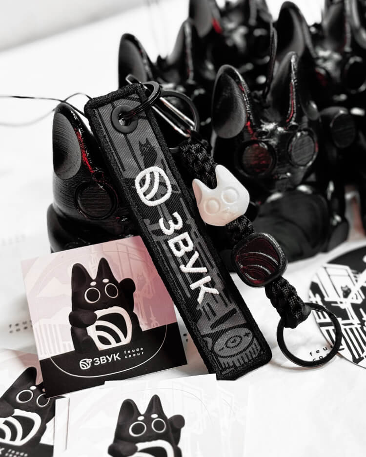 Кот с круглыми глазками настолько полюбился окружающим, что мы решили отразить его образ в серии партнёрских подарков. В комплект вошли два предмета: фигурка и брелок-перевязь с бусинами. Марина разработала модели персонажа в объёме, а после мы приступили к прототипированию и производству котиков.